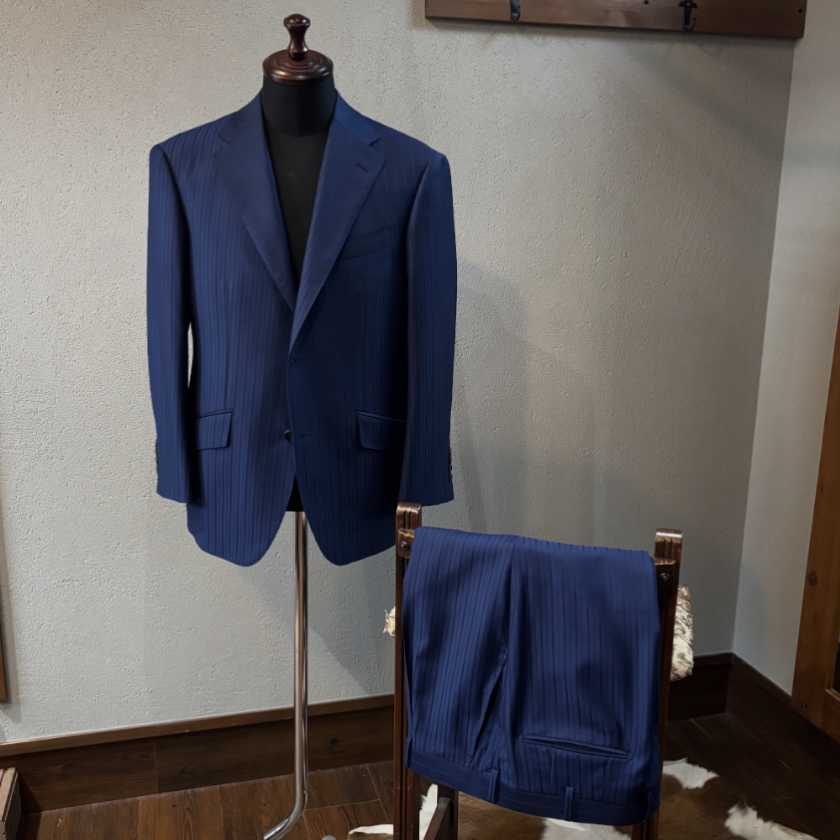 いつもご愛顧いただいておりますM様より、春物のスーツという事でCARLO BARBERAの”La Luce”より青味の強いネイビーにシャドーのストライプを配した爽やかで艶のある生地をお選びいただきました。